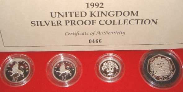 | 1992 Silver Proof Collection. £1 English Oak Tree, 50 Pence Britain's Presidency Council of Ministers & Single European Market 20th anniversary of Britain's entry into the EEC. 10 Pence 1st & Last Year of issue of the Old Ten Pence Size 28.5mm and the New Smaller 10 Pence 24.5mm.In Royal Mint box with COA. |