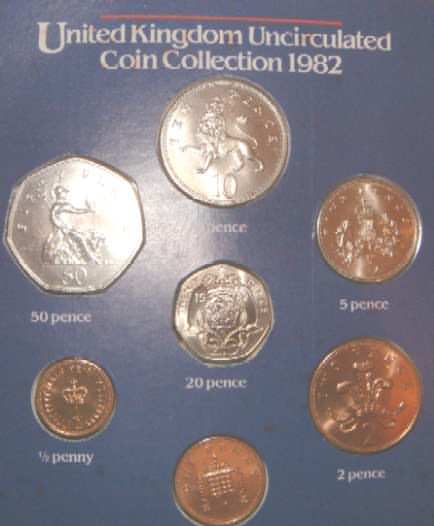1982 Mint Set (Uncirculated) 50p,20p 1st year of issue,10p,5p,2p,1p,½p 1st year that the word NEW removed from coins (eg 50 New Pence) some foxing to cover. In official issue foldout flat pack (Blister Pack) |