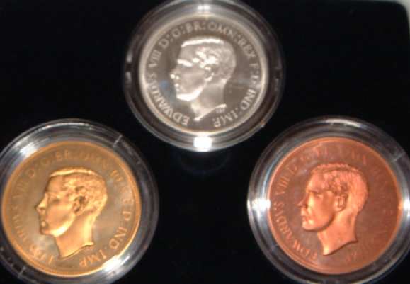 | Edward VIII Pattern Set.Set of 3 proof crowns in the following metals Silver,Copper,Bronze privately issued pieces were made to show what Edward VIII’s coinage might have looked like, if he hadn’t abdicated. Obv Crowned Bust. All Proof in box of issue |