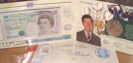 | 1998 Prince Charles 50th Birthday 5 Pound Banknote & 5 Pound Coin Special Issue £5 note with Cypher PW50 serial # 000297 out of only 1,000 printed a long with £5 coin. Issued by the Royal Mint & Bank of England for Prince Charles 50th Birthday These £5 notes only available in these sets not for general issue. In official pack with booklet & outer cover & Cert # PW50 000297 (only 1000 issued) |