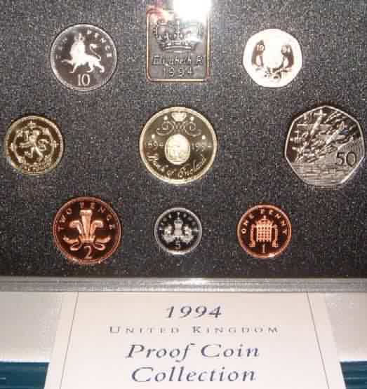 | 1994 Proof Set (Currency) £2 300th Anniversary of the Bank of England,£1 Lion Rampant Scottish,50p 50th Anniversary of D-Day Allied Invasion of Europe Operation "Overlord",20p,10p,5p,2p,1p.Blue case of issue with COA. |