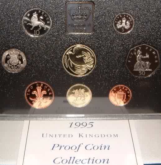 | 1995 Mint Set (Uncirculated) £2 50th Anniversary End of World War II in Europe VE Day, £1 Welsh Dragon Wales,50p,20p,10p,5p,2p,1p.In official issue foldout flat pack (Blister Pack) |